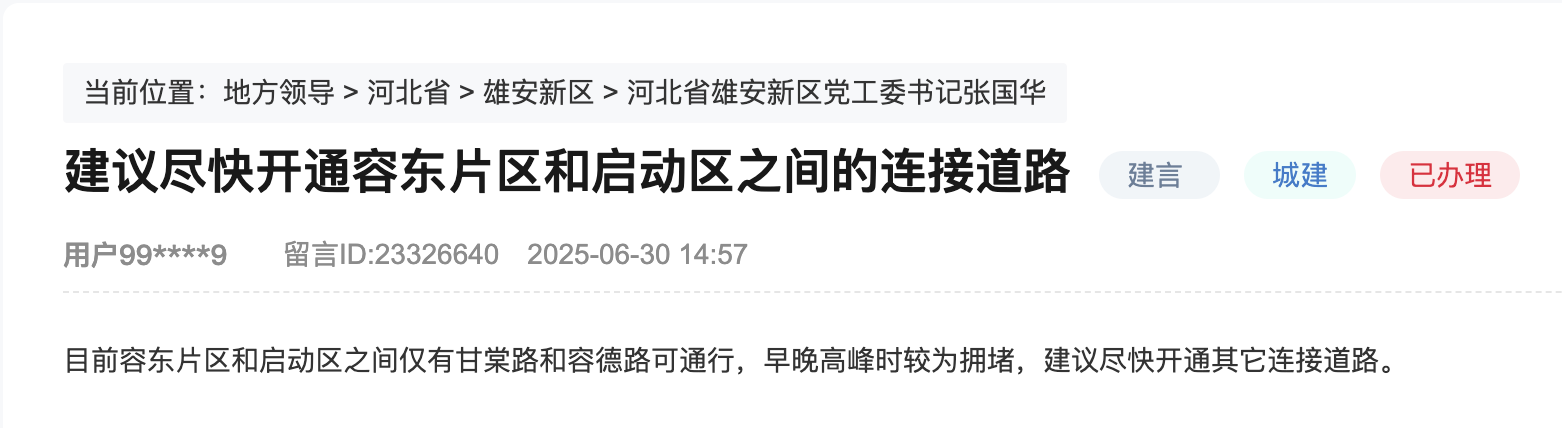 人民網(wǎng)雄安11月15日電 (記者宋燁文)有網(wǎng)民在人民網(wǎng)“領(lǐng)導(dǎo)留言板”留言,“建議盡快開通(雄安新區(qū))容東片區(qū)和啟動(dòng)區(qū)之間的連接道路”。該網(wǎng)民表示,目前容東片區(qū)和啟動(dòng)區(qū)之間僅有甘棠路和容德路可通行,早晚高峰時(shí)較為擁堵,建議盡快開通其他連接道路。 網(wǎng)民留言截圖 記者致電留言網(wǎng)民時(shí)了解到,他是疏解單位職工,已在雄安新區(qū)工作5年。