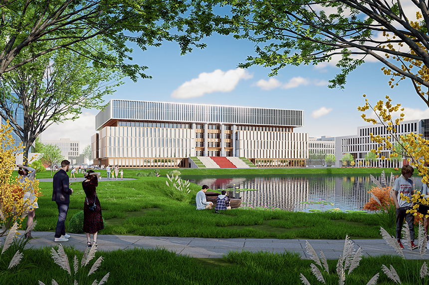 人民網雄安9月25日電 (記者宋燁文)9月24日,北京科技大學(以下簡稱“北科大”)雄安校區一期工程第二組團項目中的圖書館組團、中地塊東側生活組團、南地塊東側生活組團開工建設,標志著北科大雄安校區一期工程第二組團全部開工。目前,北科大雄安校區開工建設面積占一期工程總建設面積比重已超90%。 北科大雄安校區圖書館效果圖。